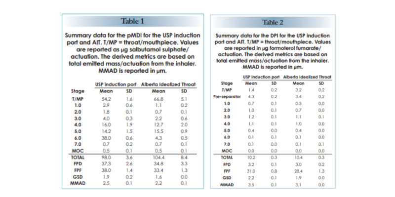 The tables below show comparative data for a commercial pMDI (active ingredient salbutamol sulphate) and DPI (active ingredient formoterol fumarate). Data were collected using the Next Generation Impactor equipped with either the AIT or USP/Ph. Eur. induction port.