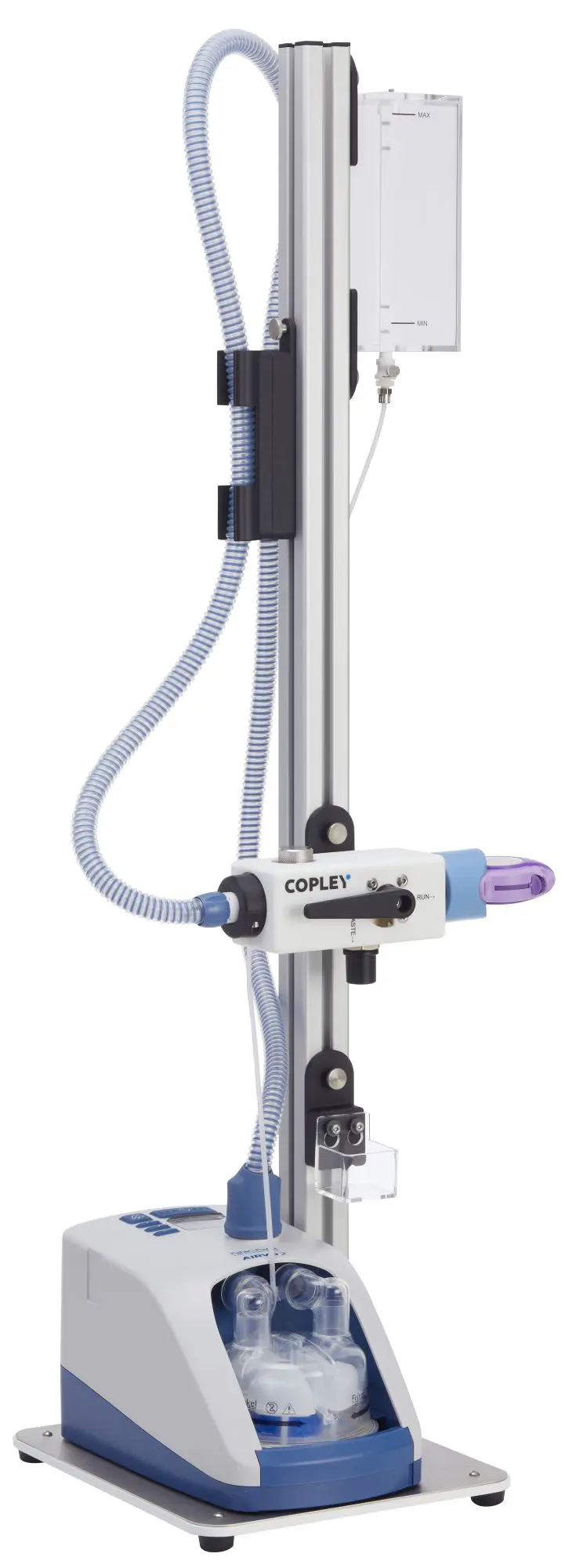Air flow to waste: At the end of the timed exhalation, the air flow is directed to ‘Waste‘ via a manually controlled valve.