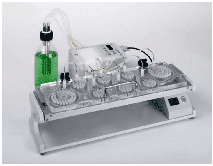 Automating the coating process frees up analysts to perform other tasks, eliminates the variability associated with a manual procedure and reduces solvent wastage. The cup coater is easy to use and holds a full set of 8 cups for simultaneous coating of all collection surfaces. The coating liquid, typically a solution of silicone oil, glycerol or PEG in a solvent such as hexane, is pumped into the rig to fill the cups and then the excess drawn out, the tray tilting to ensure the removal of all liquid. Fans assist in evaporating any remaining solvent leaving behind the sticky layer. The coating is dispensed in a fixed period of time, but the speed of the peristaltic pump used for filling and the drying time are variable, so the coating parameters can be adjusted in line with the viscosity of the solution.