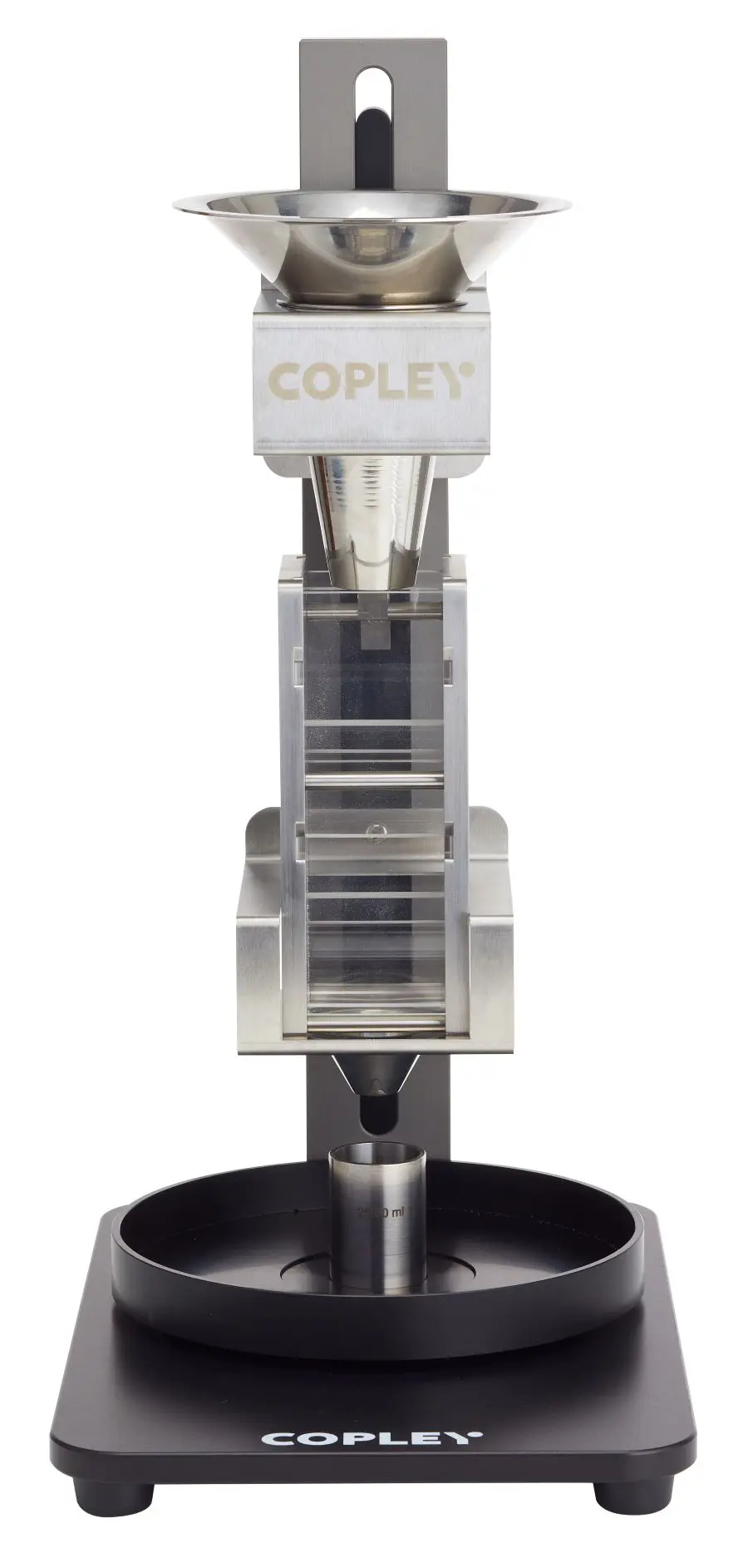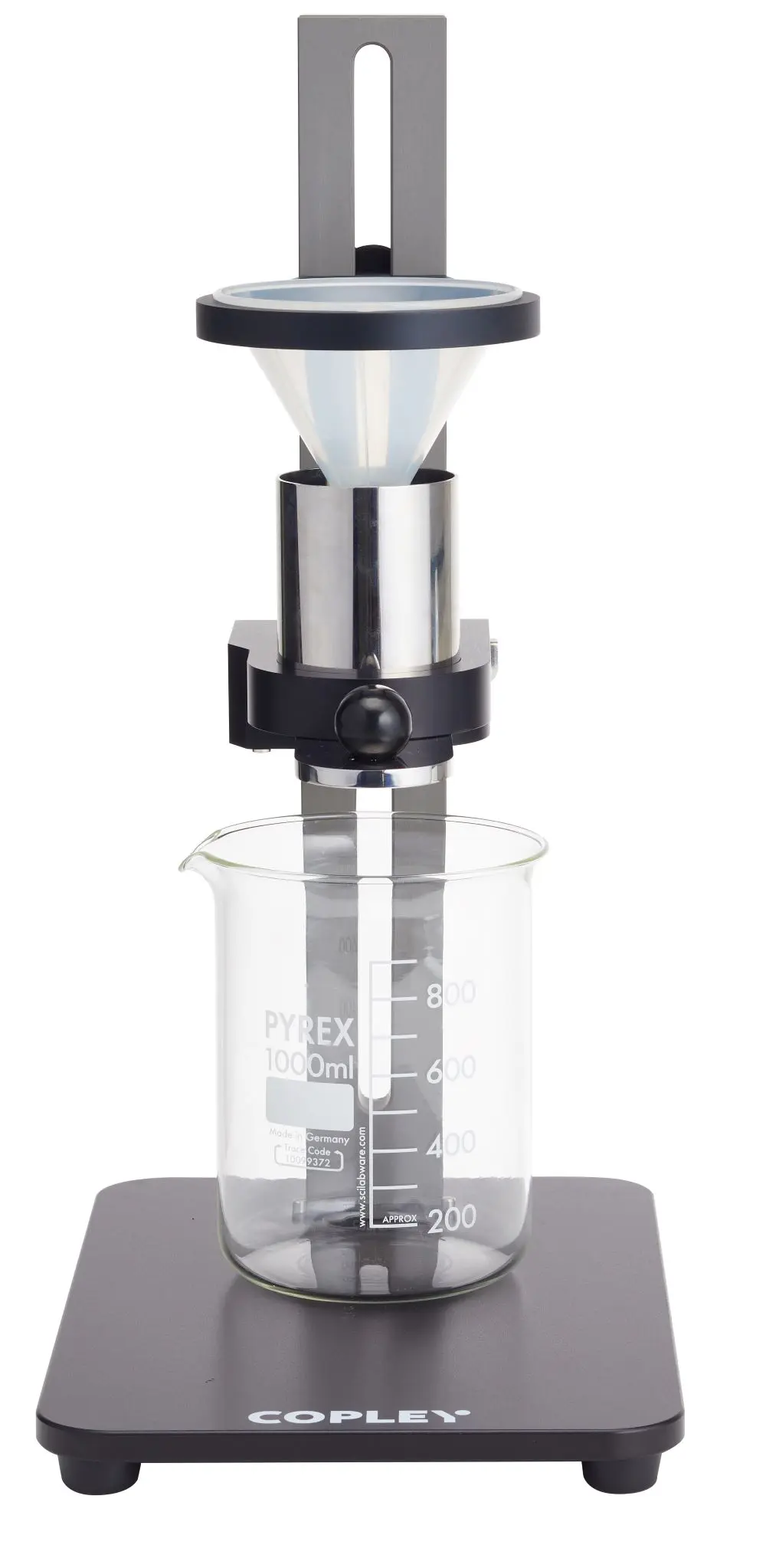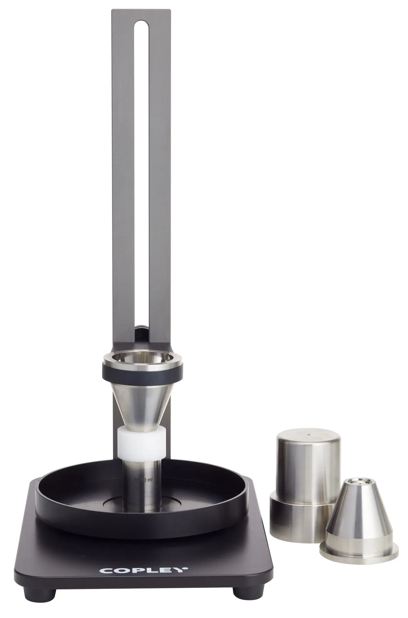 漏斗由制药级316不锈钢制成,配备5 mm、7 mm、10 mm、15 mm和25 mm孔径的快换喷嘴。使用简单易用的快门系统执行测试。