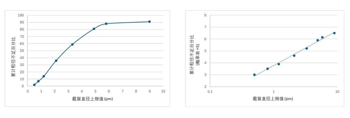 以ISM为例,我们知道撞击器的性能与流量有关。因此,多级撞击器原始数据采用层级药物质量形式,而流量决定了每级截留直径。下图以累积图 (左) 和对数-概率图 (右) 的形式展示了此类数据的示例。