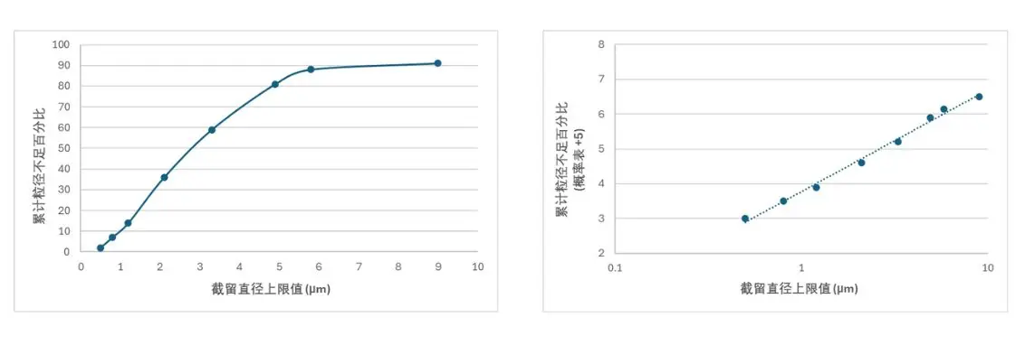 关于对数-概率图的详细讨论超出了本文的讨论范围,但有两个明显的优势。首先,对数-概率图为线性图;其次,截留直径之间的间距更加均匀。将截留直径轴 (x轴) 转换为对数刻度可以实现这一间距转换。